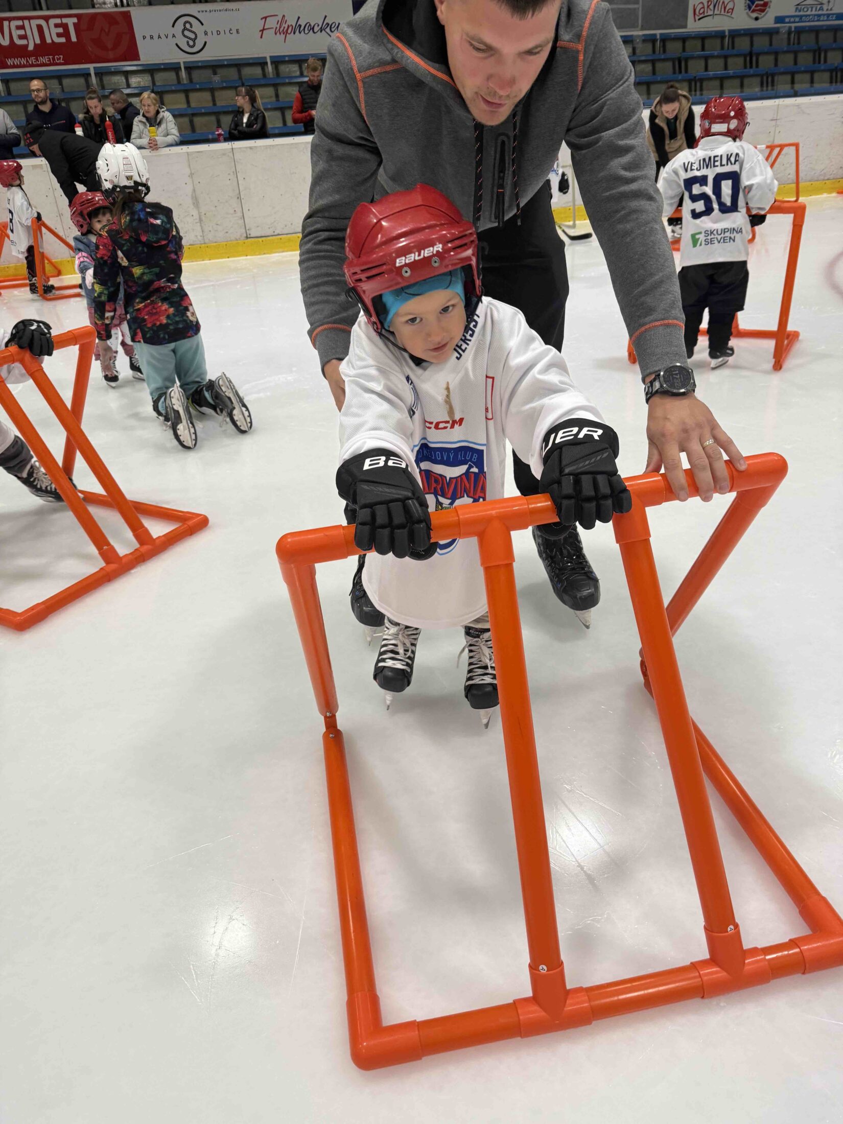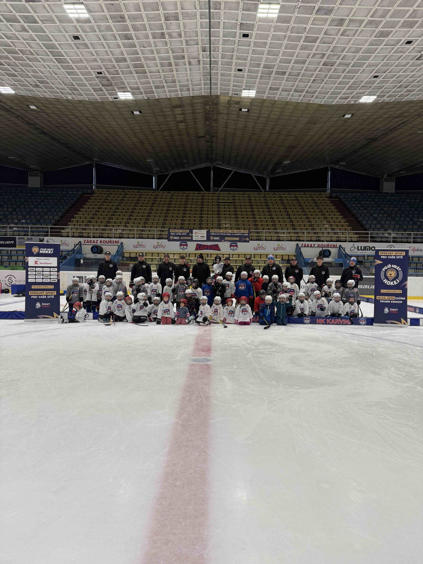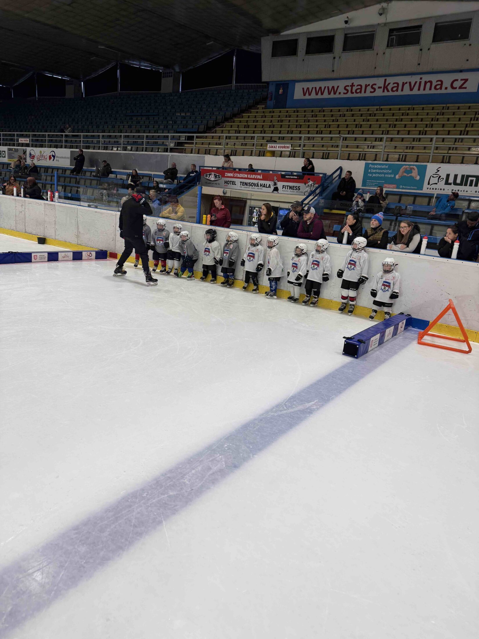 Už od 16:15 se stadion zaplnil prvními účastníky, kteří prošli online registrací a okamžitě se ponořili do nabitého programu. Zatímco rodiče vyslechli úvodní slovo předsedy klubu o tom, jak vypadá život malého hokejisty a jak HK Karviná pracuje s mládeží, děti nezahálely – čekala na ně opičí dráha plná pohybu, her a smíchu. Hokej přece není jen o bruslích a puku, ale i o obratnosti, rychlosti a radosti ze hry.