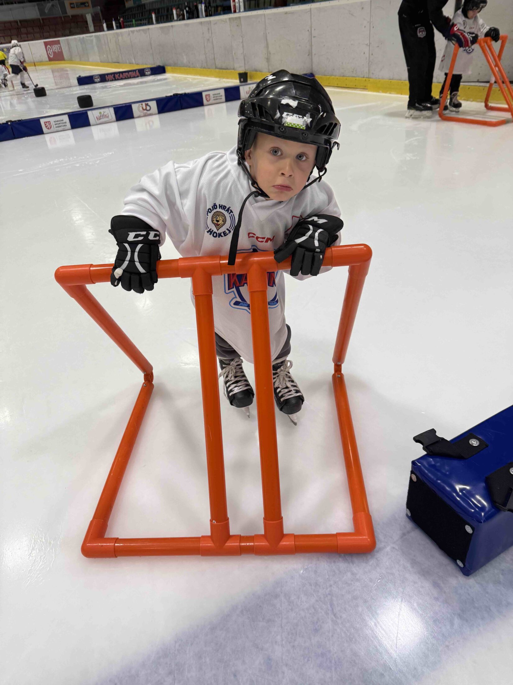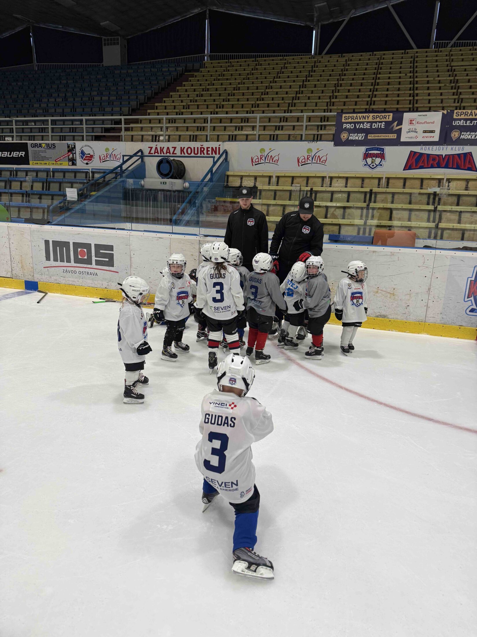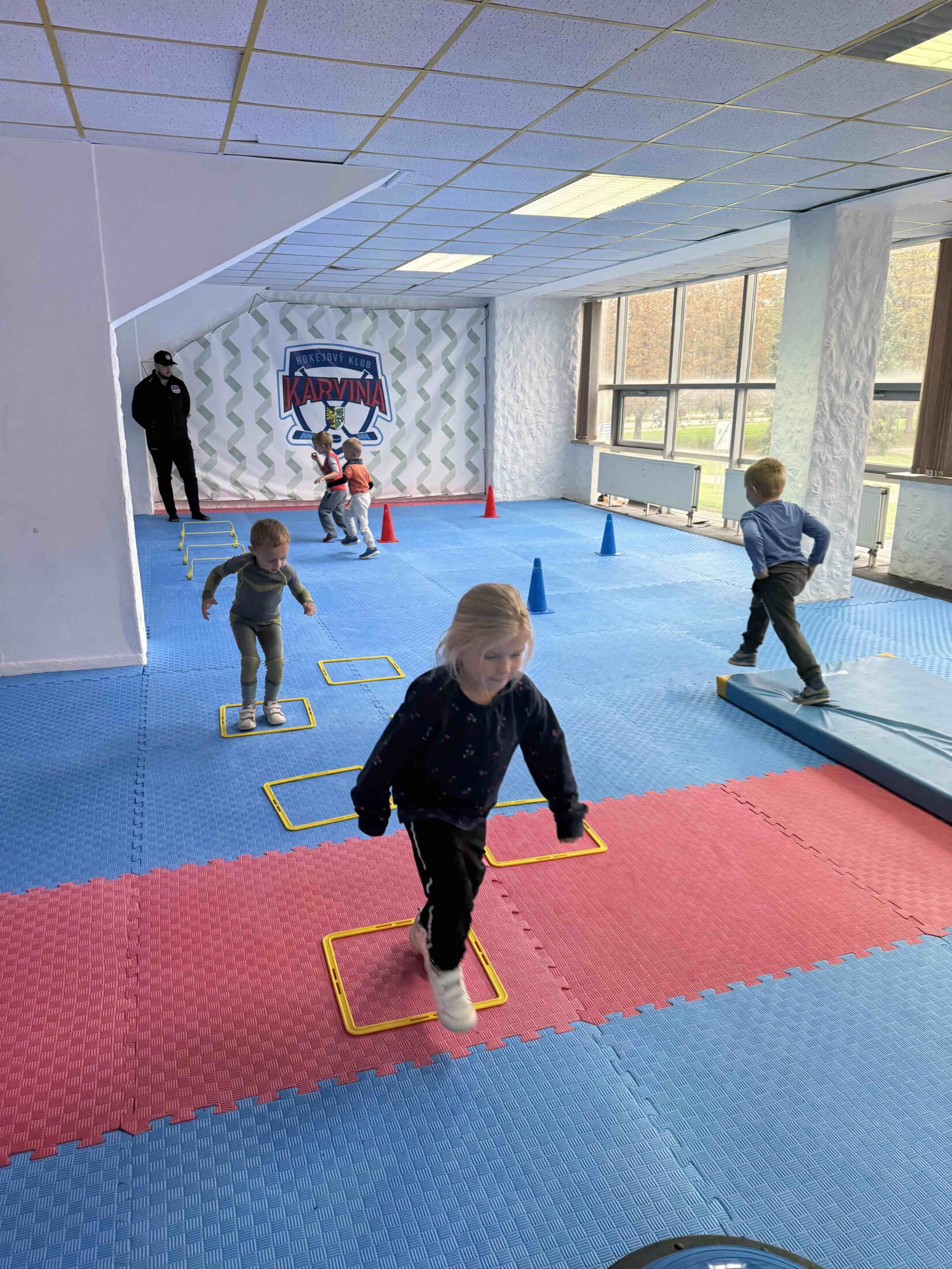 Už od 16:15 se stadion zaplnil prvními účastníky, kteří prošli online registrací a okamžitě se ponořili do nabitého programu. Zatímco rodiče vyslechli úvodní slovo předsedy klubu o tom, jak vypadá život malého hokejisty a jak HK Karviná pracuje s mládeží, děti nezahálely – čekala na ně opičí dráha plná pohybu, her a smíchu. Hokej přece není jen o bruslích a puku, ale i o obratnosti, rychlosti a radosti ze hry.